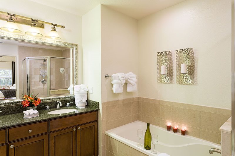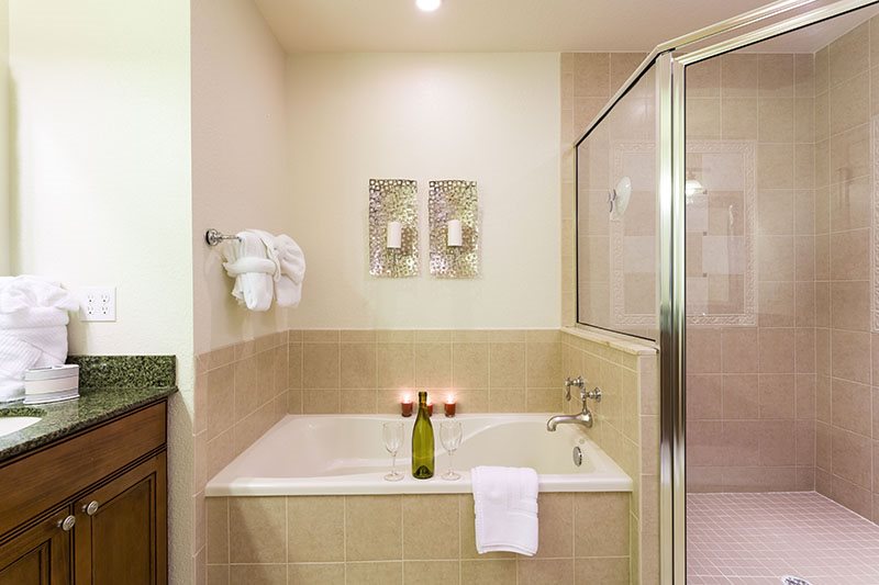 The Master en-suite bedroom has a luxury King bed, complete with a large 40" LED TV and Blu-Ray player. There is a large walk-in closet, an electronic safe, and a large en-suite bathroom with dual sinks, a bathtub, and a walk-in separate shower.