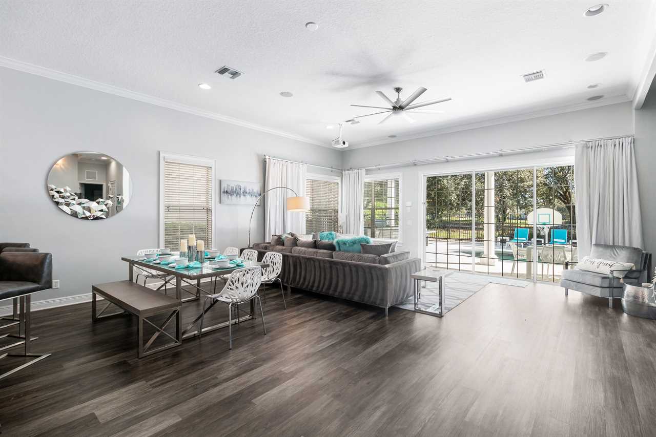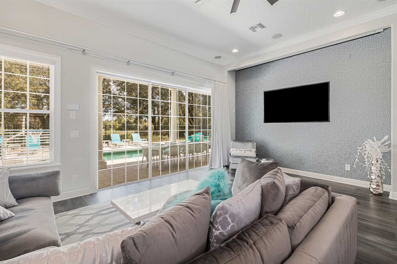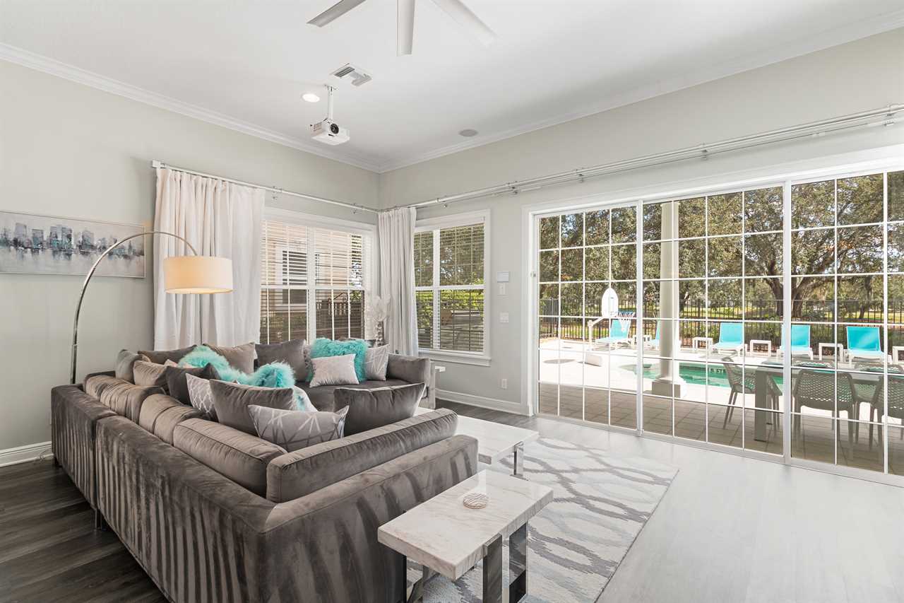 As you walk into this home you are greeted by natural light and an open concept layout. Your living space is simply perfect for the family vacation with an open floor plan, allowing the entire family to cook, dine and hang out. You will love the massive kitchen with beautiful grey granite countertops. Experience the magic in the evenings and watch a Disney movie or two on your very own 75-Inch, 4K SMART TV and an electric drop-down 150-Inch projector screen with an upgraded cable package. Enjoy your comfy sectionals that seat 8 and a beautiful dining area that comfortably seats 10.