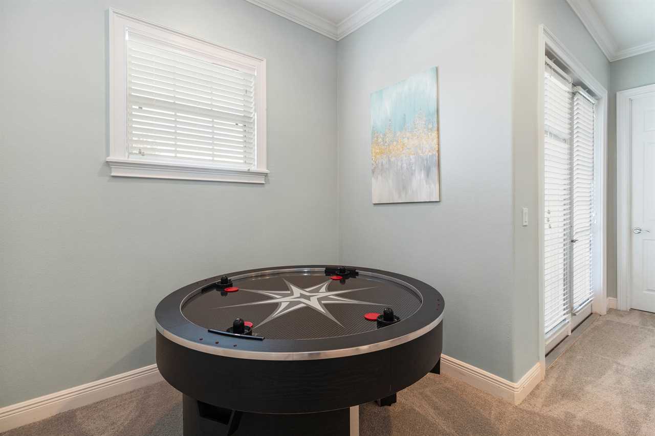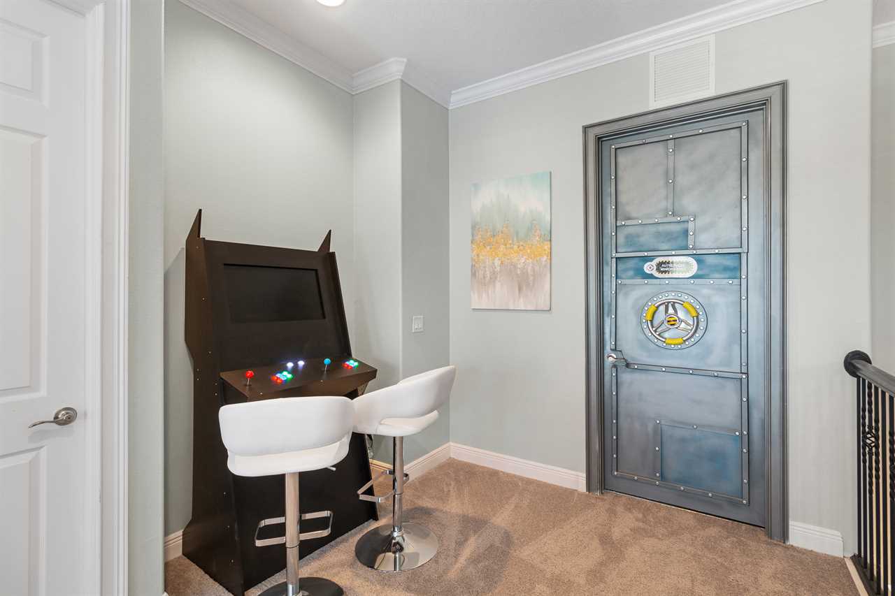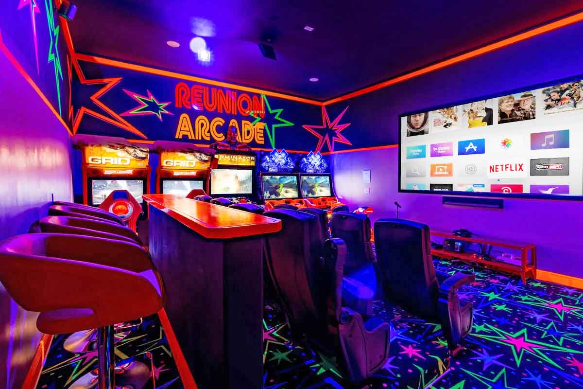 Feeling competitive? Enter the game room, boasting regular light, or can be used as a black-lit room for fun. You will find 2, synced Sega racers as well as 2 synced snowcross arcades. There is also a 2 player Terminator Salvation arcade and a basketball arcade. Want the kids to watch their own movie or play on a PS4 or Xbox One? Then they can do so in the game room with a 120-screen, Apple TV 2 and theater seating for 8 and bar seating for 4. There is also a karaoke set-up for fun-filled evenings.