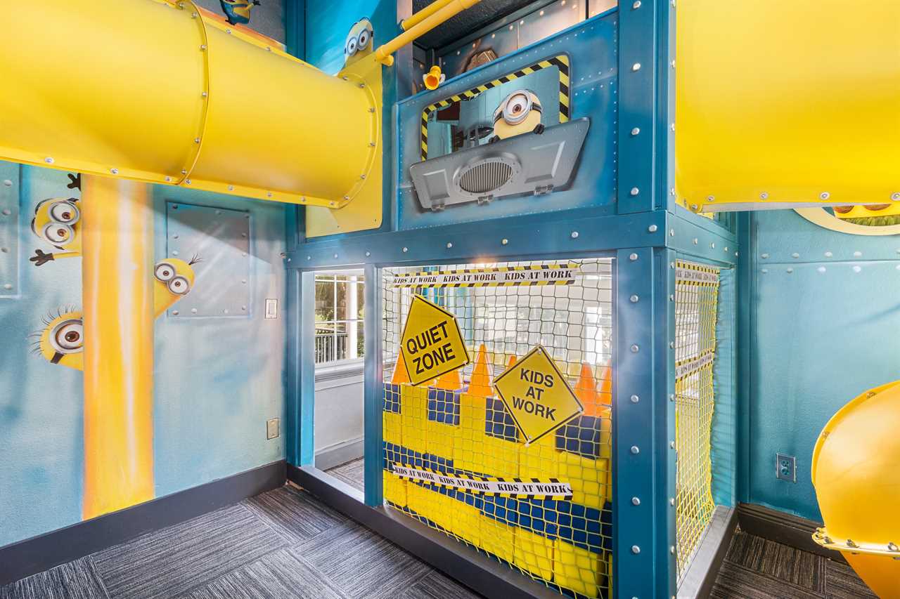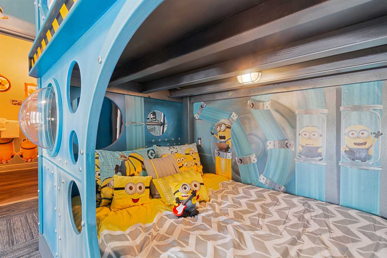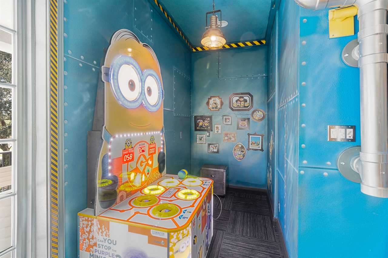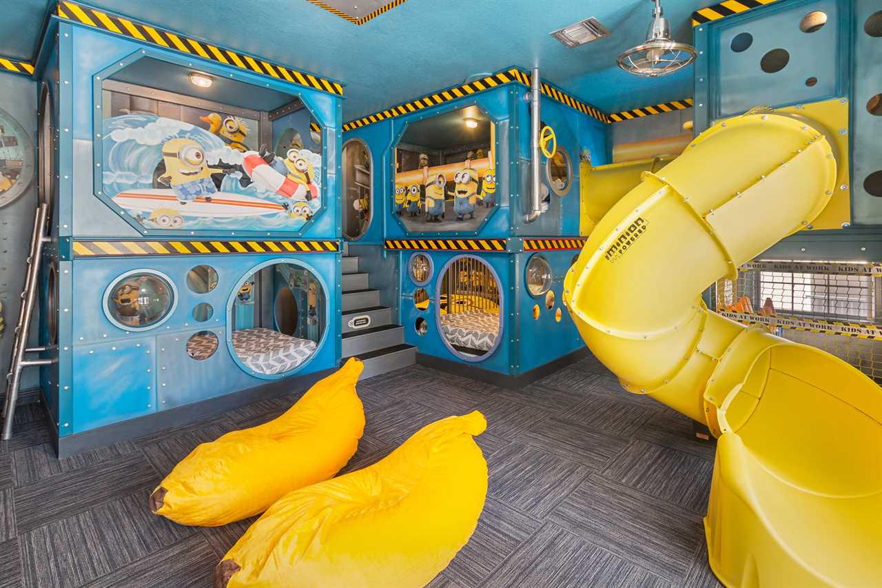 Upstairs there are four further bedrooms, the second King-size master suite with en-suite bathroom offering a tub, walk-in shower and twin vanities with access to the large balcony. Enter into a very large kids bedroom with 4 full beds, spiral slide and a fun Minion whacker arcade, a secret playroom, and an en-suite bathroom. The two remaining bedrooms, one having a King-size bed with a space theme and fiber optic ceiling and the other a beautiful princess theme bedroom with two full beds, share a "Jack n Jill" bathroom. All bedrooms come with large SMART TV's. Disclaimer: Firepit(s) not allowed for guest use, homeowner use only.