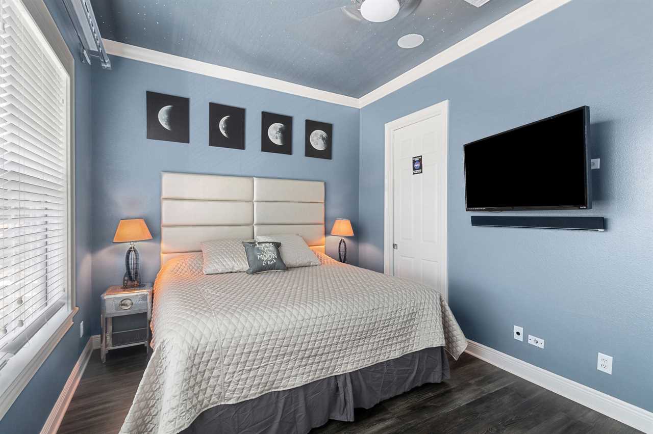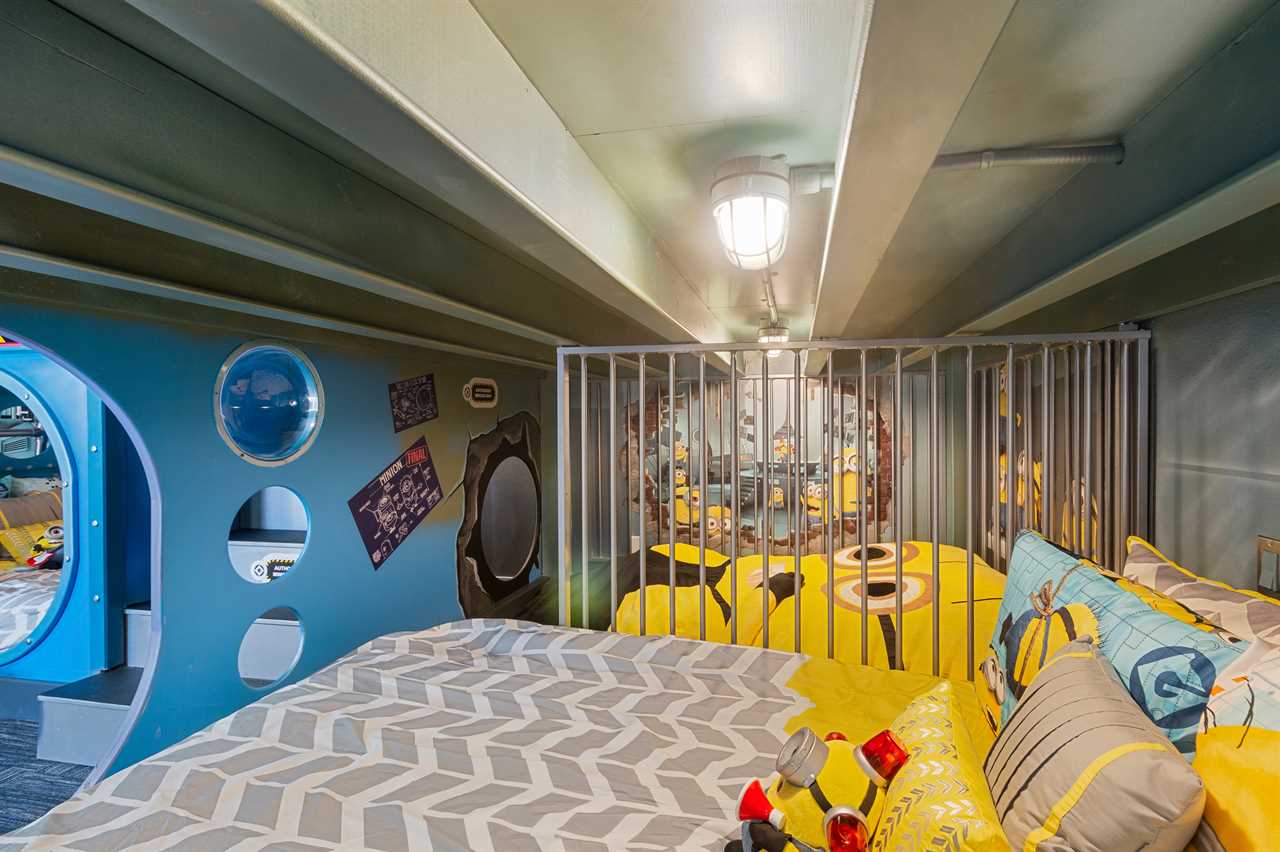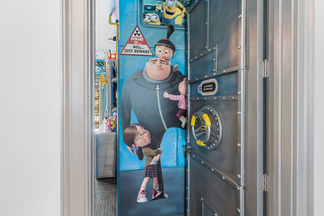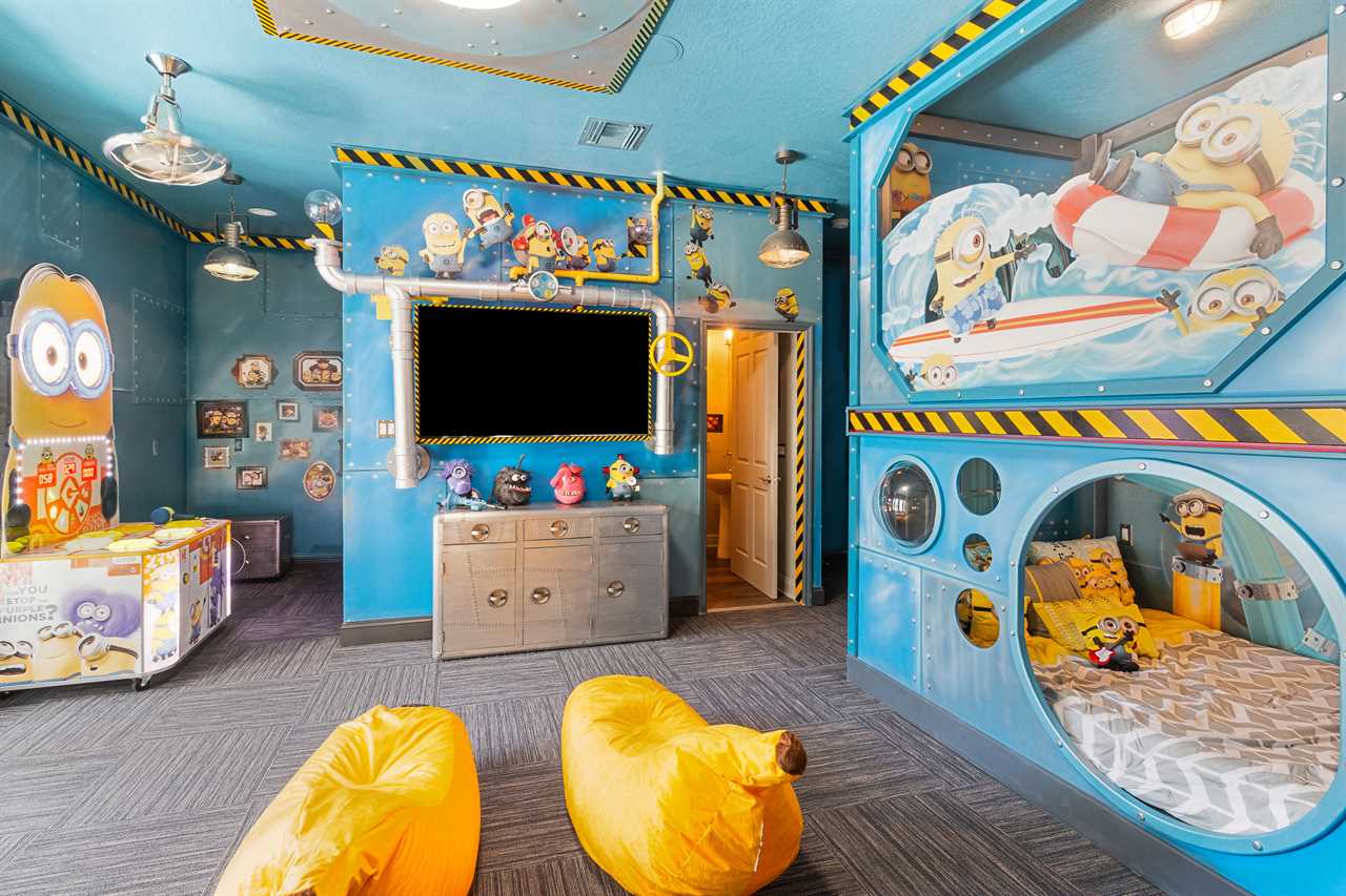Upstairs there are four further bedrooms, the second King-size master suite with en-suite bathroom offering a tub, walk-in shower and twin vanities with access to the large balcony. Enter into a very large kids bedroom with 4 full beds, spiral slide and a fun Minion whacker arcade, a secret playroom, and an en-suite bathroom. The two remaining bedrooms, one having a King-size bed with a space theme and fiber optic ceiling and the other a beautiful princess theme bedroom with two full beds, share a "Jack n Jill" bathroom. All bedrooms come with large SMART TV's. Disclaimer: Firepit(s) not allowed for guest use, homeowner use only.