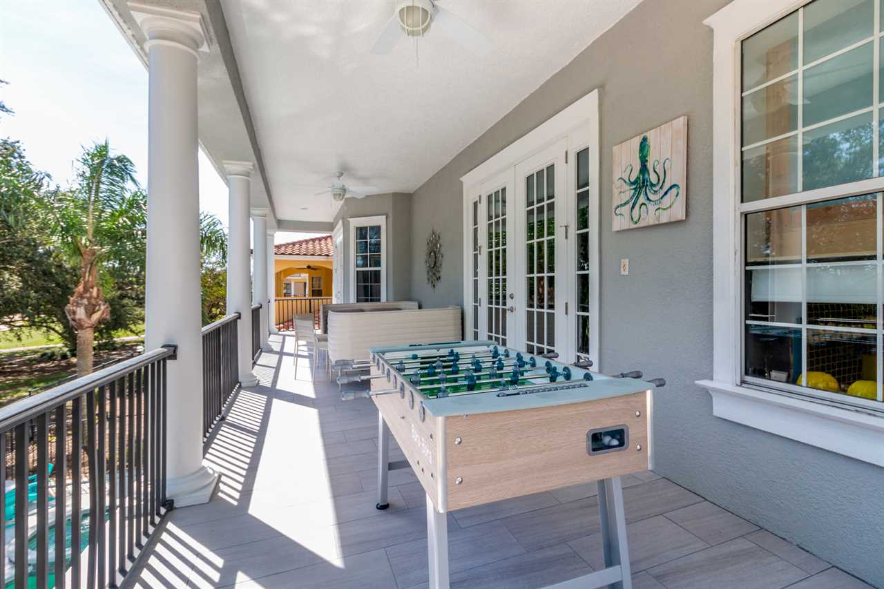 Upstairs there is an open den that has a 4 player air hockey table and stand-up multi arcade. There is also access to the rear balcony. On the large rear balcony, you will find great views as well as an outdoor foosball table and lounge seating for 6.