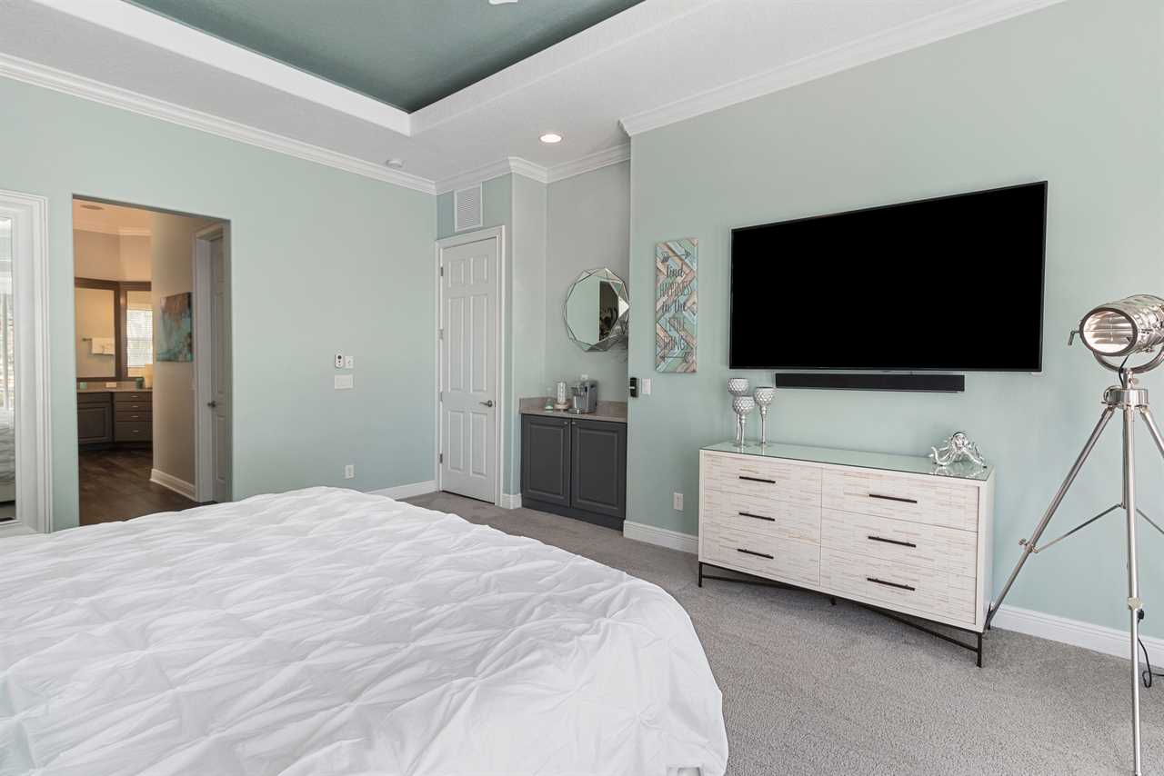 The ground floor Master bedroom with access to the pool deck has a King-size bed, wall-mounted 75-Inch TV with soundbar and an en-suite bathroom with dual sinks, separate tub, and walk-in shower.
