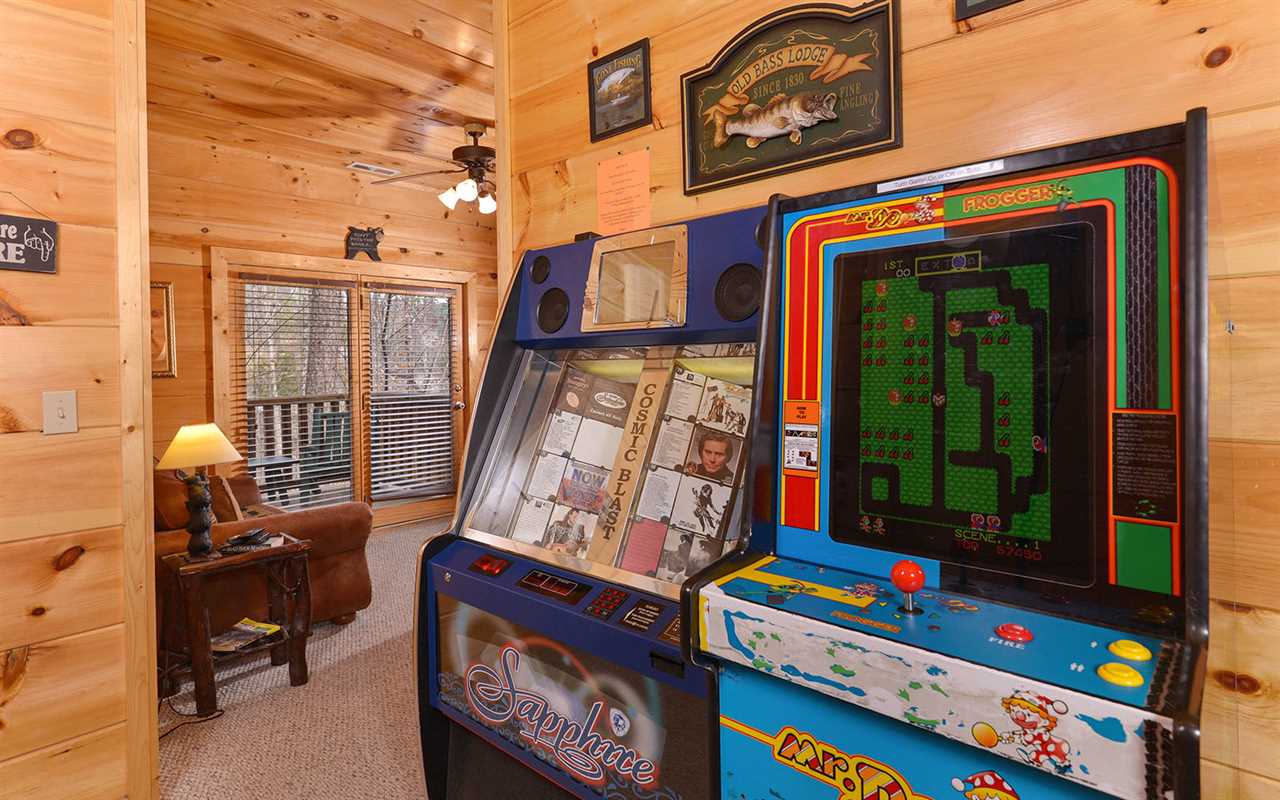 Inside, you can spread out in the living room and chat with a cozy fire in the gas fireplace or watch entertainment on the flatscreen TV with premium cable channels. Better yet, head to the rec room with arcade games and a theater space that features a big screen TV with DVD/Blu-ray players and theater-style seating for movie nights! There's also another sitting area with sofas and a flatscreen TV around the corner.