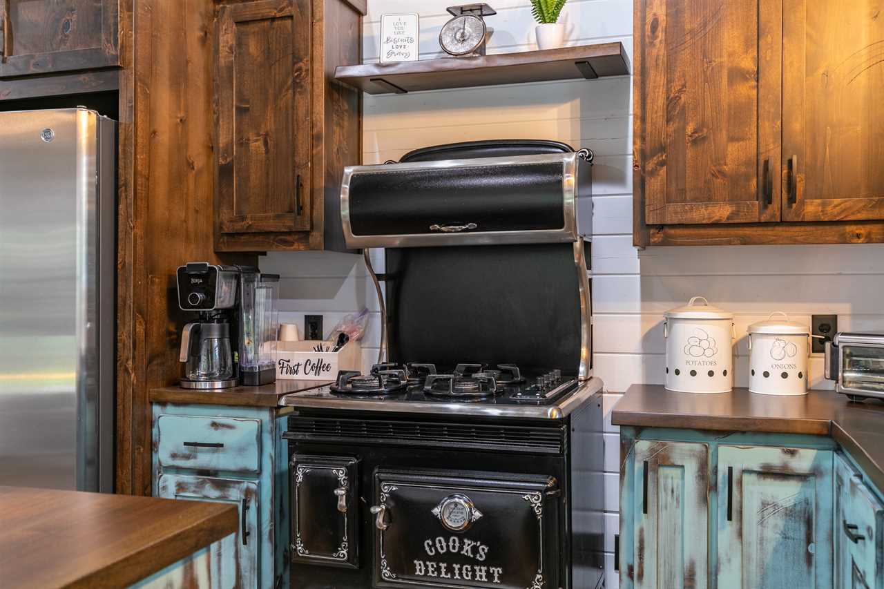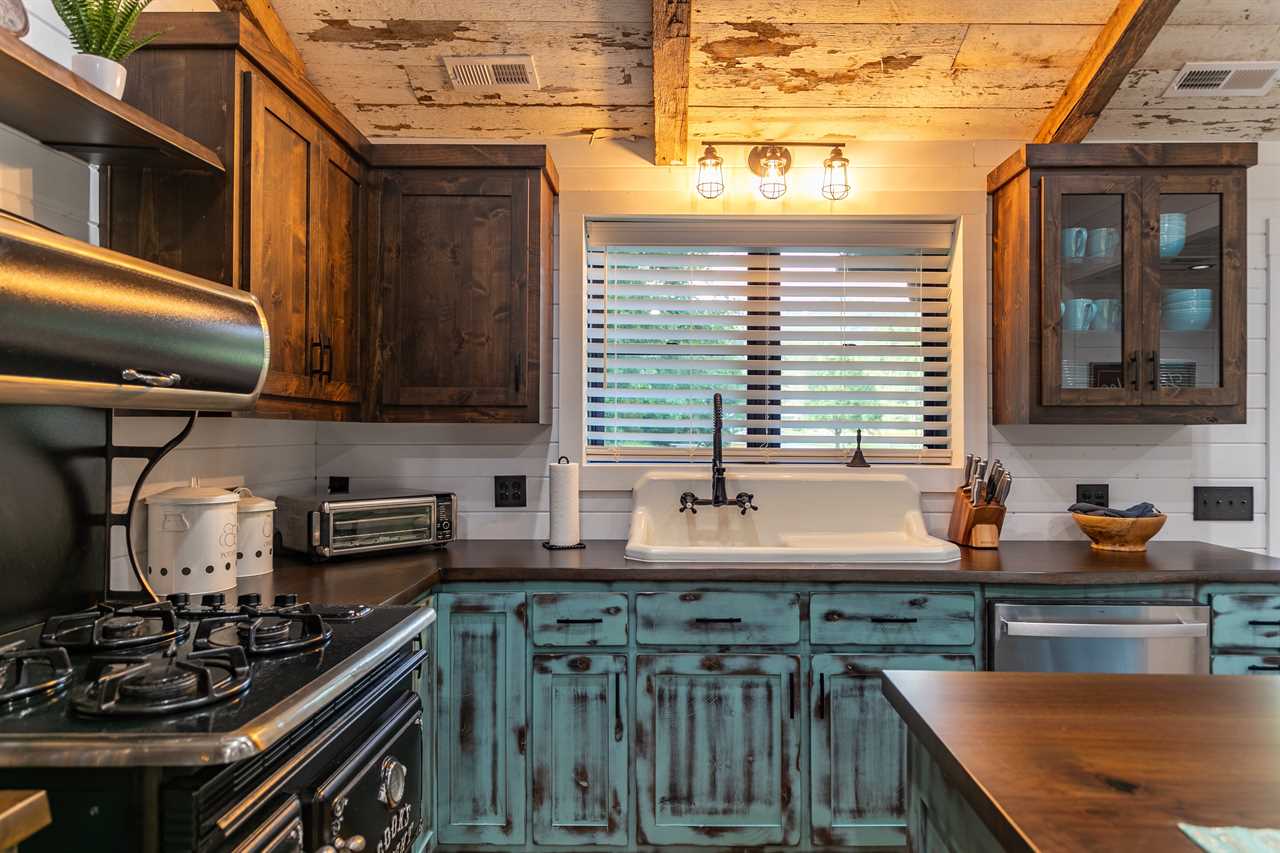 A bright, modern kitchen with updated appliances, ample counter space, and farmhouse-style touches.