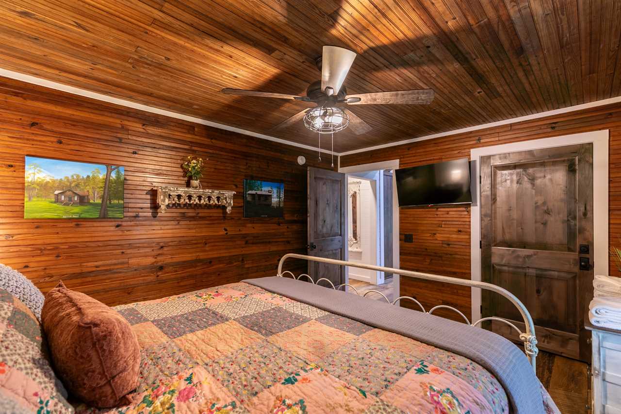 Bedroom 1: King bed with a mounted TV and ceiling fan