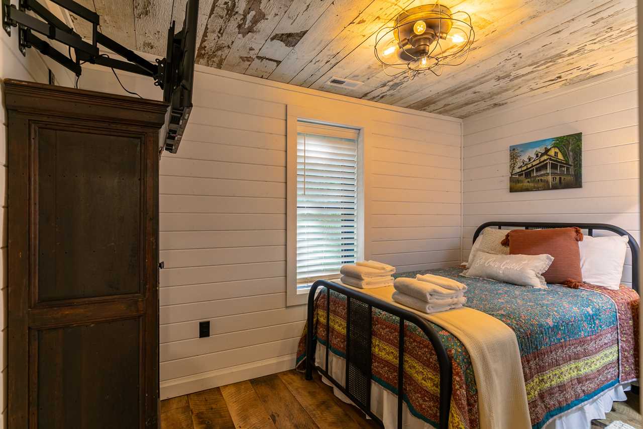 Bedroom 2: Full bed with a mounted TV and ceiling fan