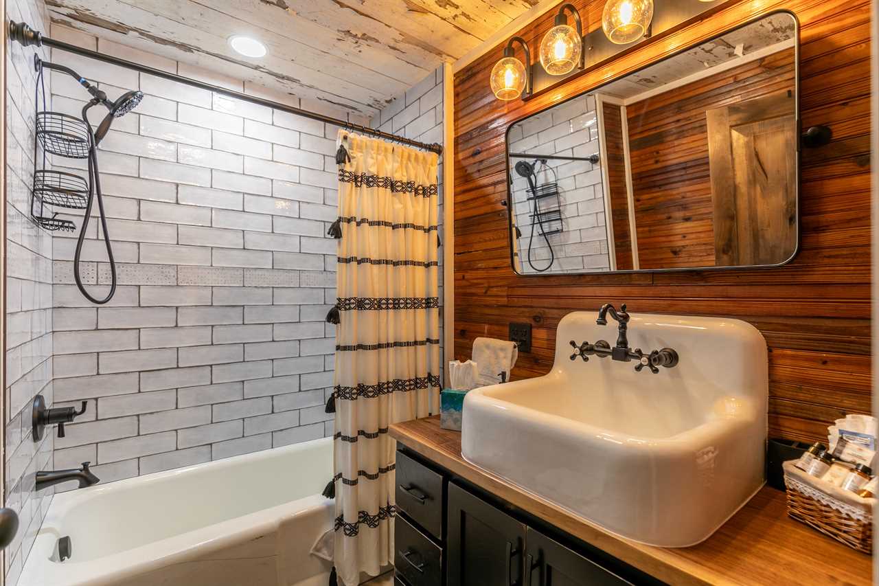 A fully renovated bathroom, combining farmhouse elegance with contemporary fixtures.