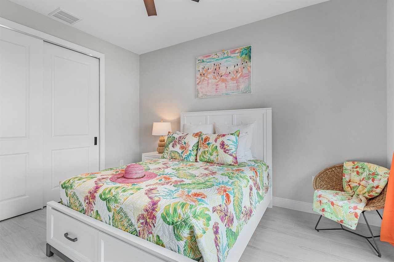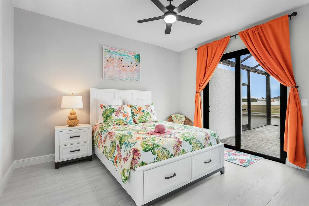 Guest Bedroom 1: Queen-size bed, Smart TV, Direct Pool Access