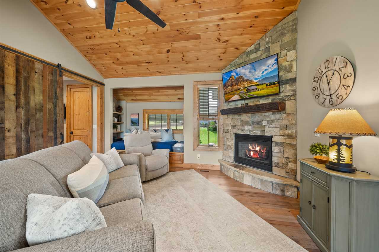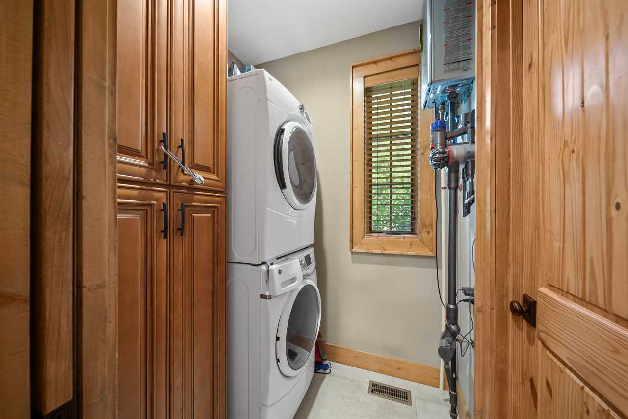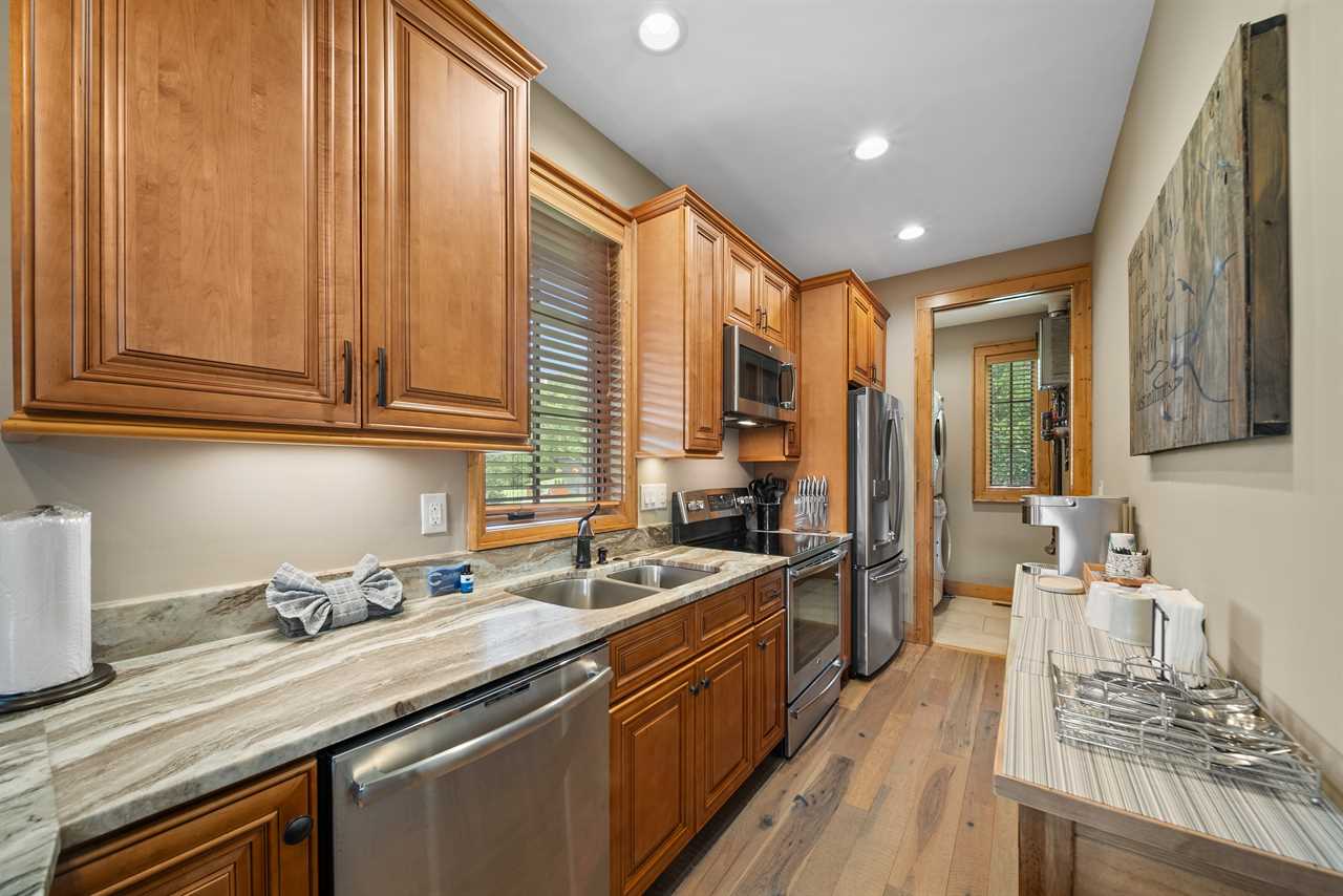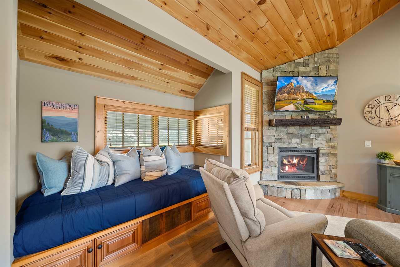 The living room features a gas log fireplace, a large smart TV, and a comfortable sofa, with a bonus twin bed tucked along the wall for additional sleeping space. The kitchen is outfitted with granite countertops, stainless steel appliances, and a Keurig—perfect for your morning coffee. A full-size laundry center is just off the kitchen for added convenience.