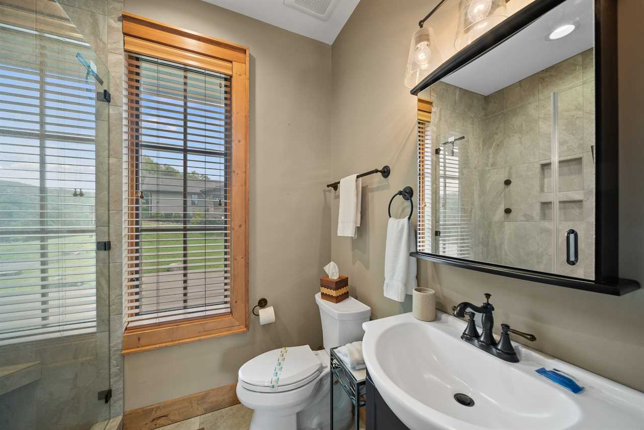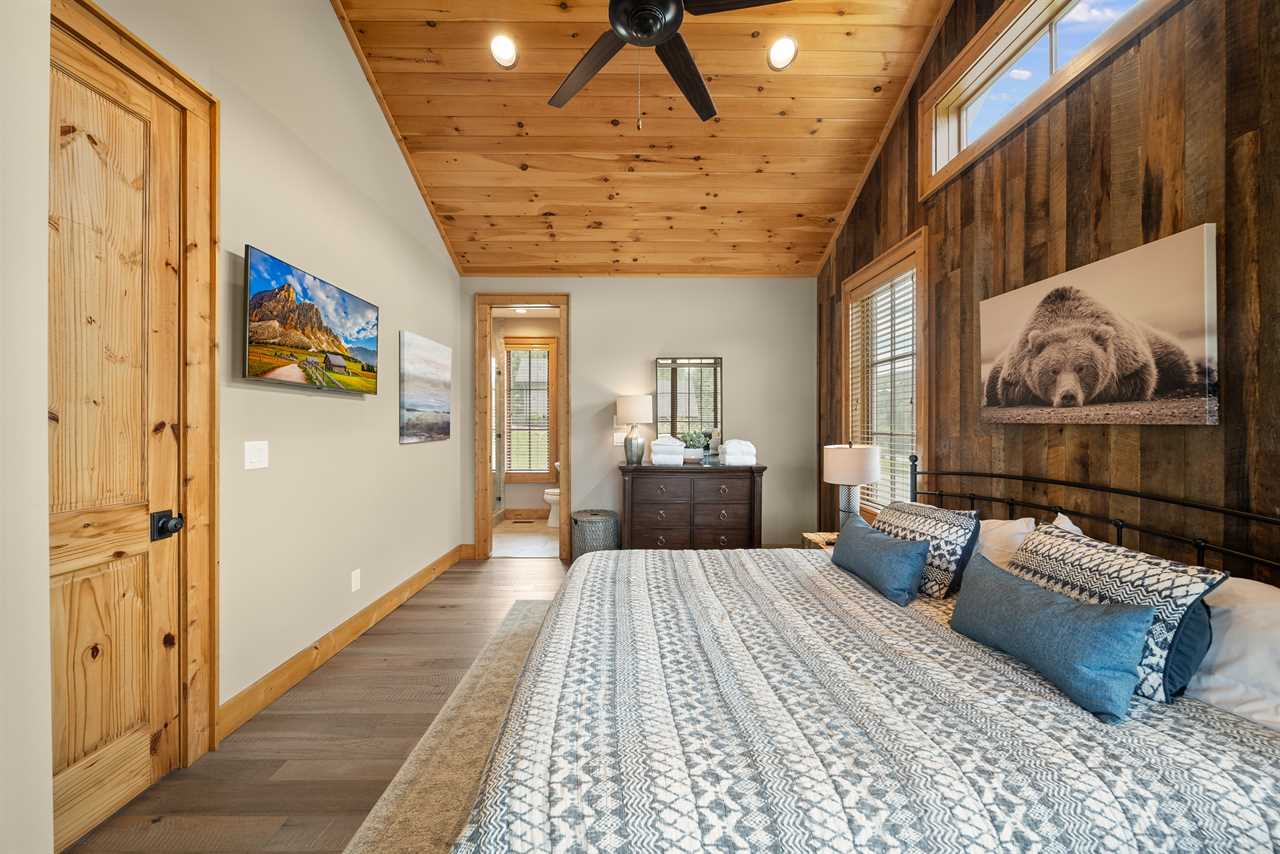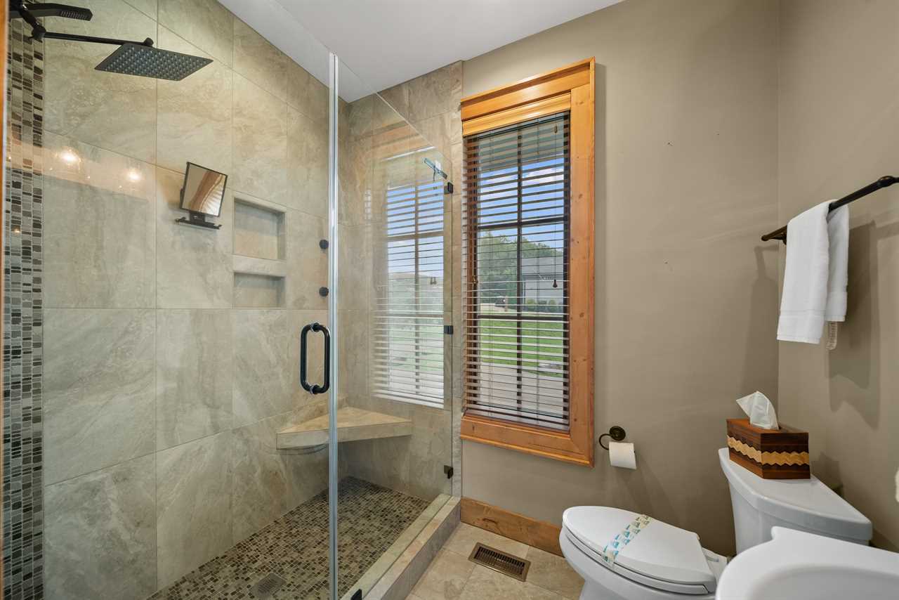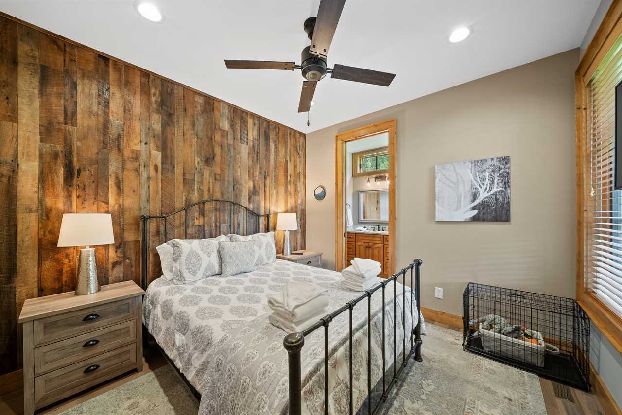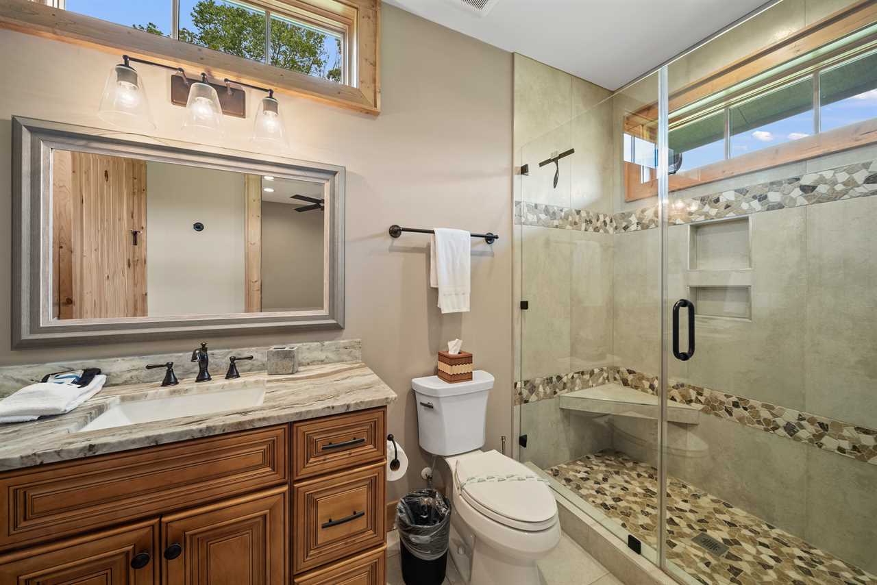 Each bedroom is located on opposite sides of the home for added privacy. The primary bedroom includes a king bed, TV, and access to a stunning full bath. The second bedroom features a queen bed and an en-suite bathroom that also opens to the hallway. Both bathrooms are beautifully appointed with granite countertops and custom tiled showers with glass doors.