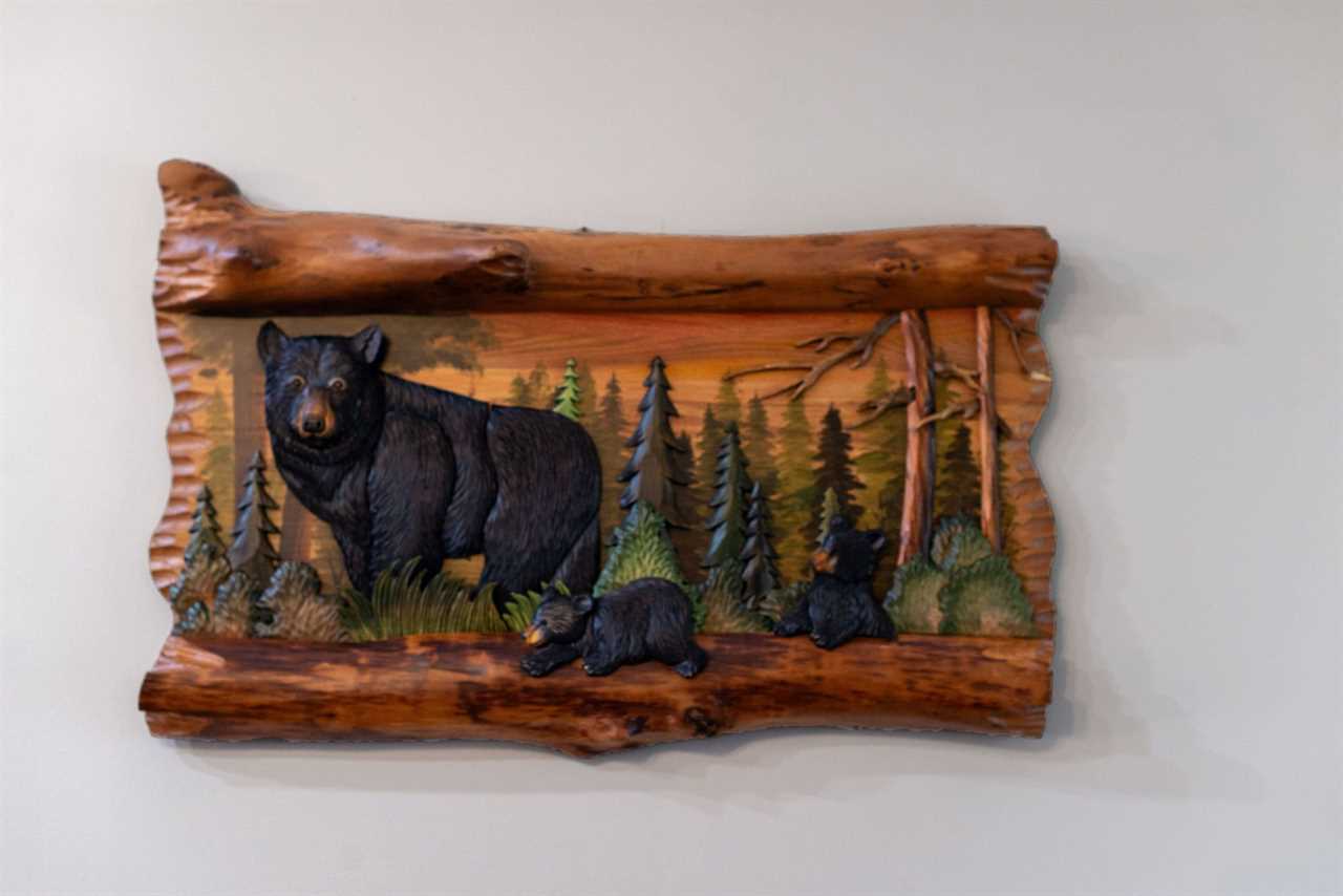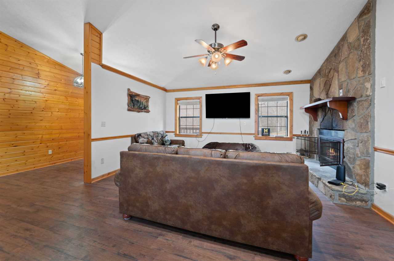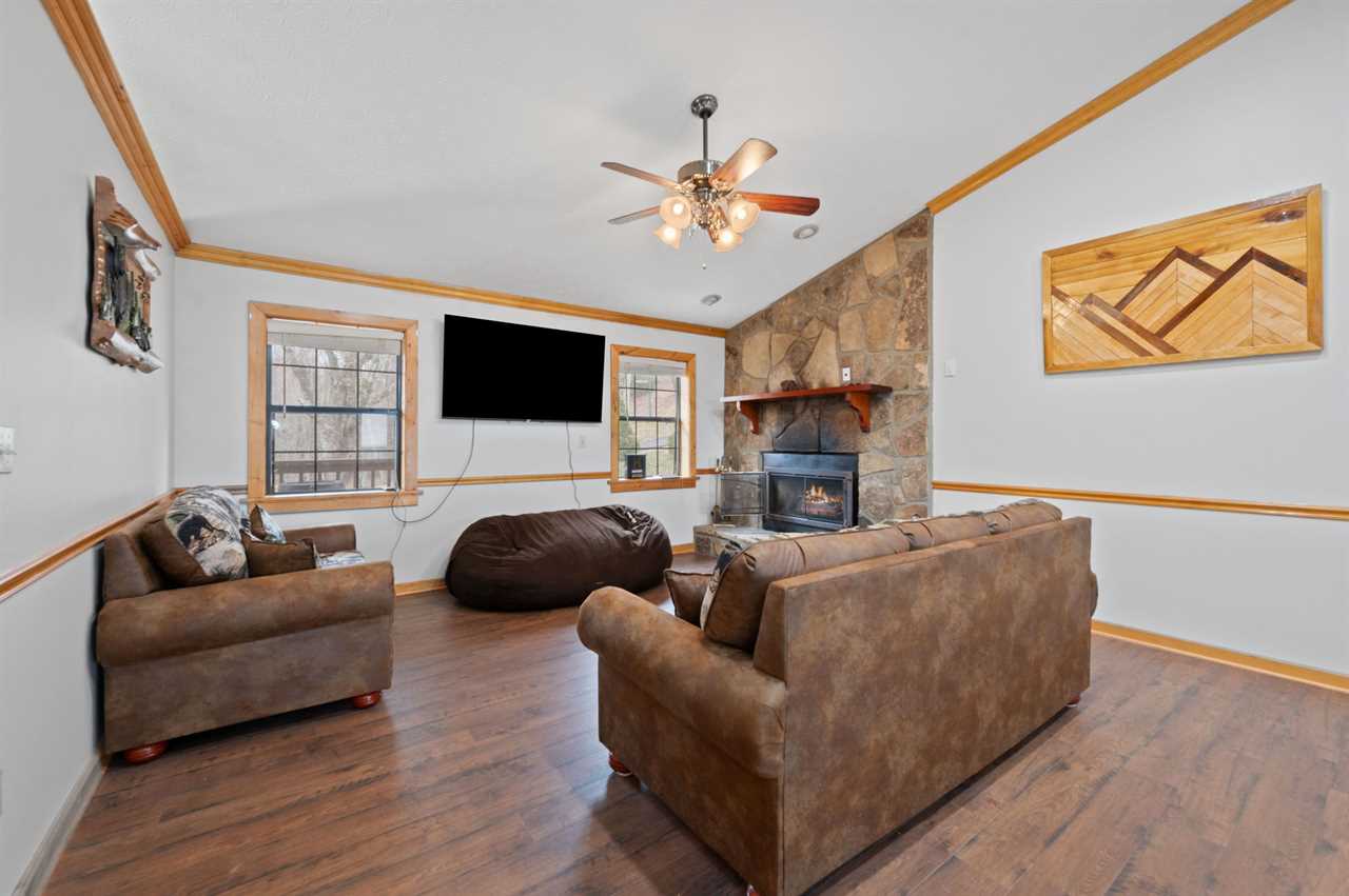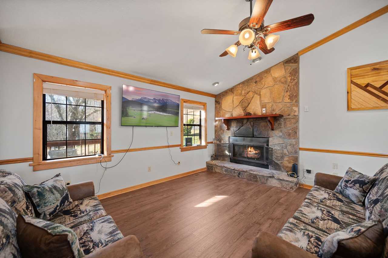 Step into a warm and inviting living room that blends rustic charm with modern comfort. The loveseat and sleeper sofa, upholstered in a combination of leather and bear-print fabric, provide both style and comfort for relaxing after a day in the mountains. Gather around the stone gas fireplace for a cozy evening or enjoy your favorite shows on the large flat-screen TV with streaming services. With its open flow into the dining area and kitchen, this space is perfect for spending time together with family and friends. For added convenience, a full-sized washer and dryer are located just down the hall.