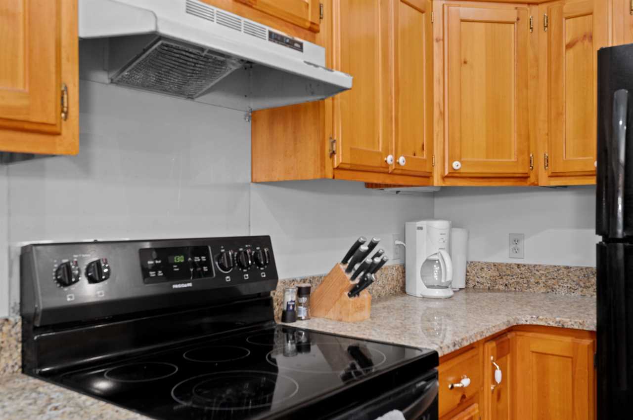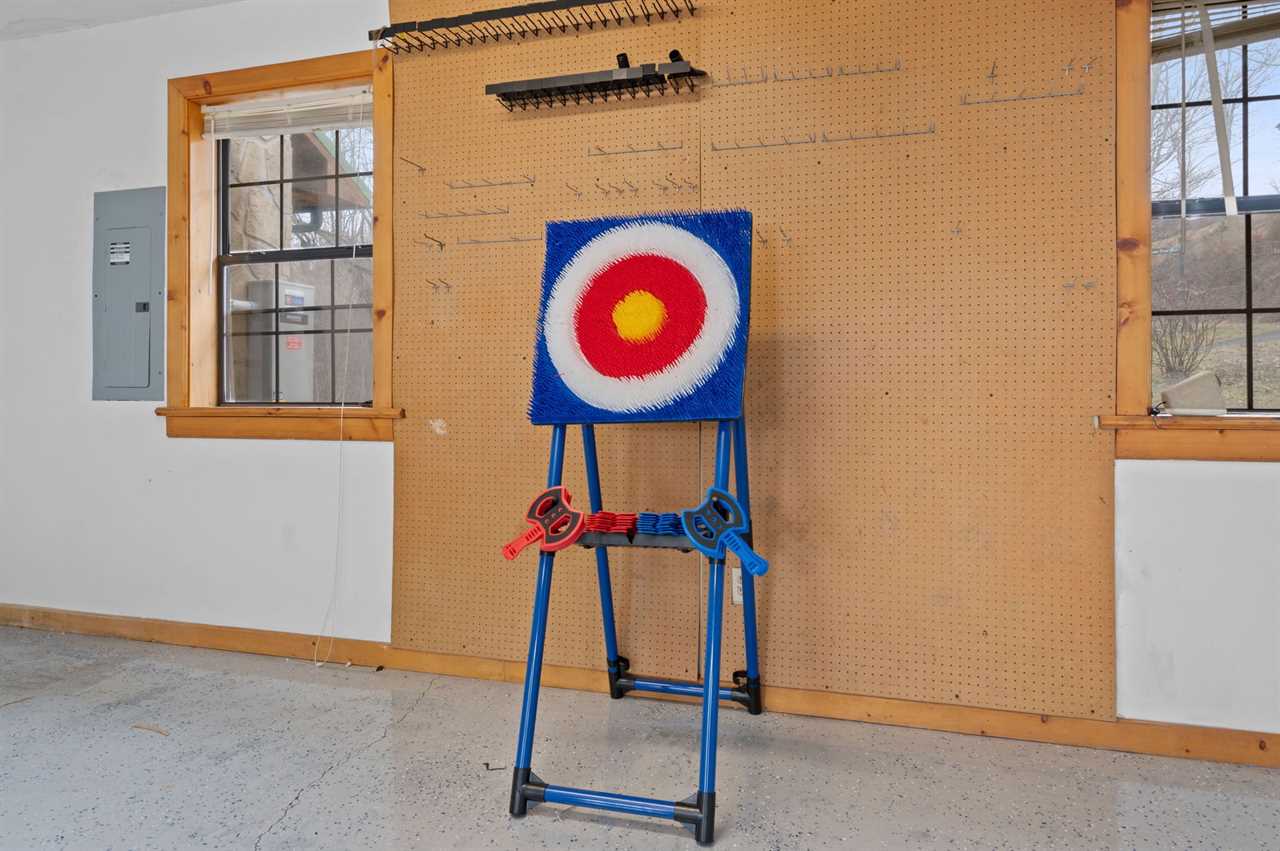 Directly off the living room, the kitchen and dining area provide the perfect space for meals and gathering. A log dining table seats eight comfortably, with additional countertop seating for two. The fully equipped kitchen includes a full-sized refrigerator, electric range, dishwasher, microwave, coffee maker, Keurig, and toaster, along with dishes and utensils for your stay. Double doors open to the back deck, while a side door leads to the garage, which features a dart and axe-throwing board for extra fun. Dish towels, starter dish soap, and starter dishwasher pods are provided.